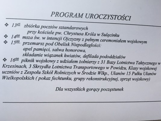 Delegacja Zarządu , wraz z pocztem sztandarowy brała udział w uroczystych obchodach Święta Niepodległości zorganizowanych w Sulęcinku, na zaproszenie Starosty Powiatu Średzkiego i Wójta Gminy Krzykosy .